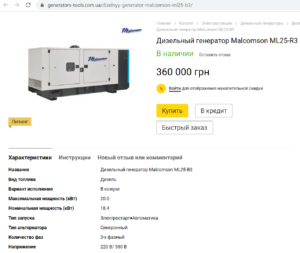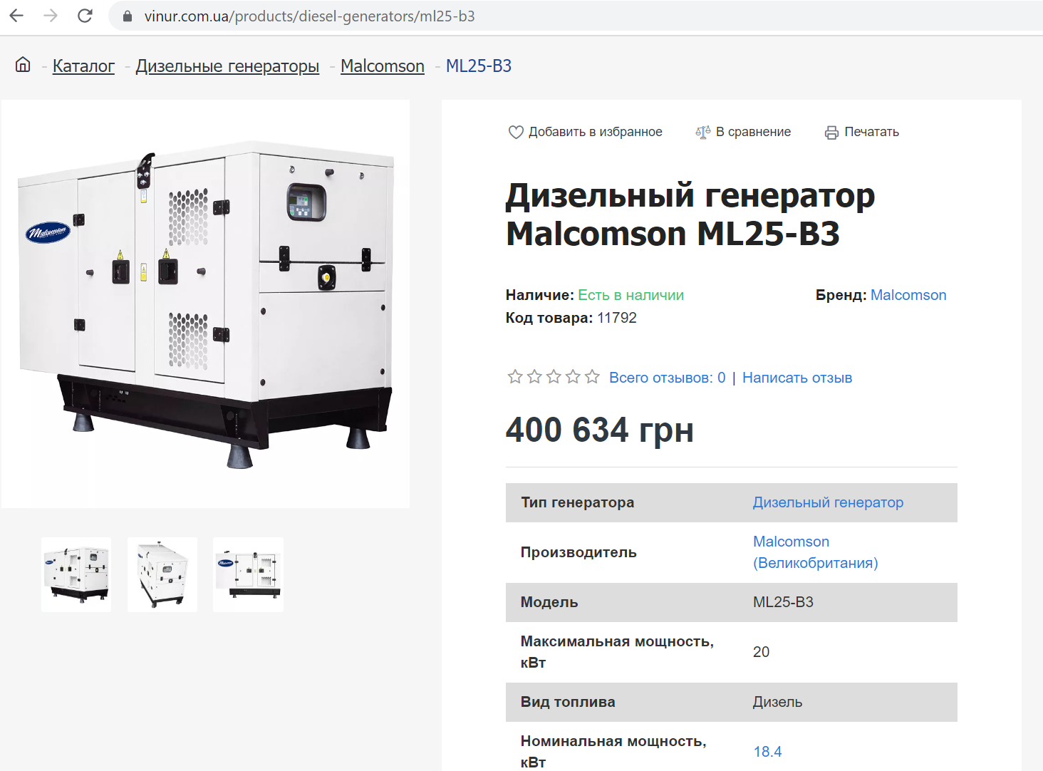Решта генераторів дизельні й стаціонарі, і їх теж уже немає в продажу. Наприклад, три штуки Global Techtop AS25S/B повною потужністю 23/25 кВА із номінальною напругою 400В/230В, паливним баком 80 л і витратою палива 4 л/год замовили по 680 тис грн, але нещодавно магазин в Рівному пропонував їх на «Bigl» на 31% дешевше – по 520 тис грн.