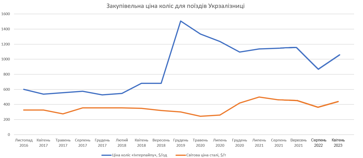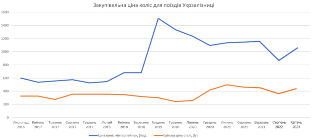 Загалом зміна доларової ціни коліс слідує за зміною ринкових цін на сталь, але сильніше виражена. Нині ціна сталі на біржі «LME» складає $424 за тонну. В серпні 2022 року вона була на 9% нижчою – $390 за тонну, а у вересні 2021 року на 4% вищою – $439 за тонну.