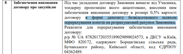 При цьому тендерна документація містить вимогу щодо забезпечення виконання договору у розмірі 0,5% вартості договору. Тобто підрядчик повинен своїми грошима гарантувати виконання робіт,  а оплату за це може отримати після війни.