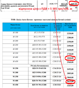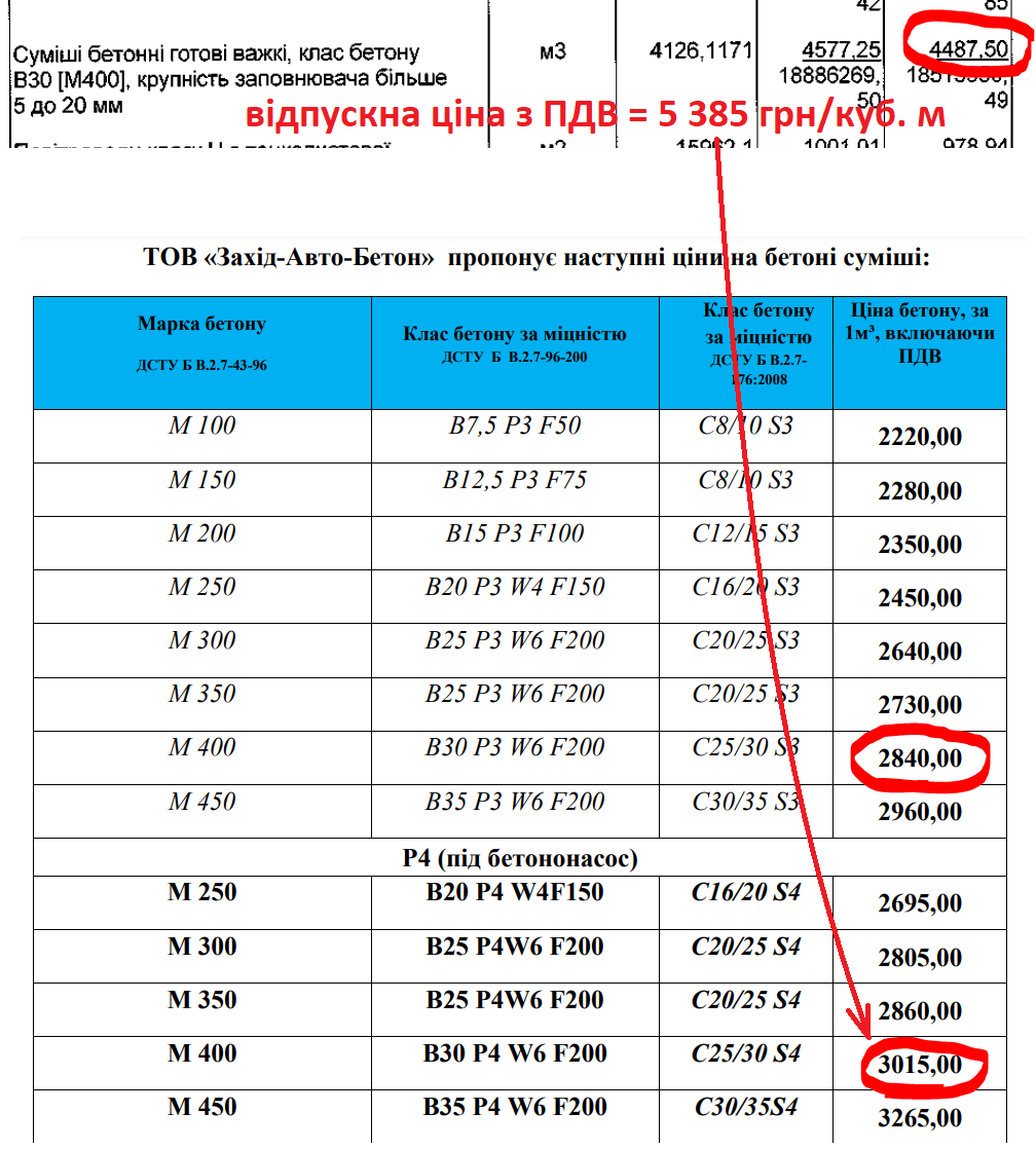 Що ж до будматеріалів, то найбільше коштів іде на важкі готові бетонні суміші, ціни яких до двох разів вищі від ринкових цін. Наприклад, бетон В30 М400 врахували по 5 385 грн/куб. м (тут і далі ціни будматеріалів вказано із ПДВ). Місцеві виробники пропонують його майже вдвічі дешевше. Наприклад, «Захід-Авто-Бетон» у серпні пропонував по 3 015 грн/куб. м. Загалом у кошторисі на бетон як товар (тобто доставка оплачується окремо) закладено 34 млн грн. А значить маржа складе близько 14 млн грн лише на бетоні.