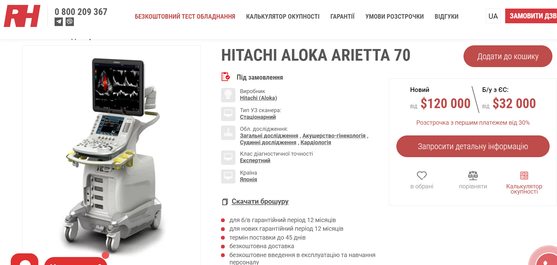 Хіба що ультразвукова діагностична система експертного класу Arietta 70 вказана за 4,00 млн грн без ПДВ. З урахуванням 7% медичного податку це 4,28 млн грн. Фірма «RH» продає нові по ціні від $120 тис, або 4,36 млн грн.