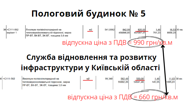 Полівінілхлоридний лінолеум на теплозвукоізолювальній підоснові марки ПР-ВТ, ВК-ВТ, ЭК-ВТ товщиною 3,6 мм враховано по 990 грн/кв. м. Нещодавно Служба відновлення та розвитку інфраструктури у Київській області замовляла «Грін Трейдінг» такий самий лінолеум для капремонту житлового будинку в Ірпені по 660 грн/кв. м, що в півтора рази дешевше.