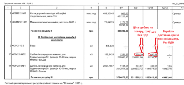 Так само дорогий щебінь і у волинських підрядах фірми «ПБС» (Івано-Франківськ), але у неї значно дешевші розцінки на роботу техніки. А найдешевші ціни у волиньських кошторисах – в контрактах з місцевою фірмою «Волиньдорбуд».