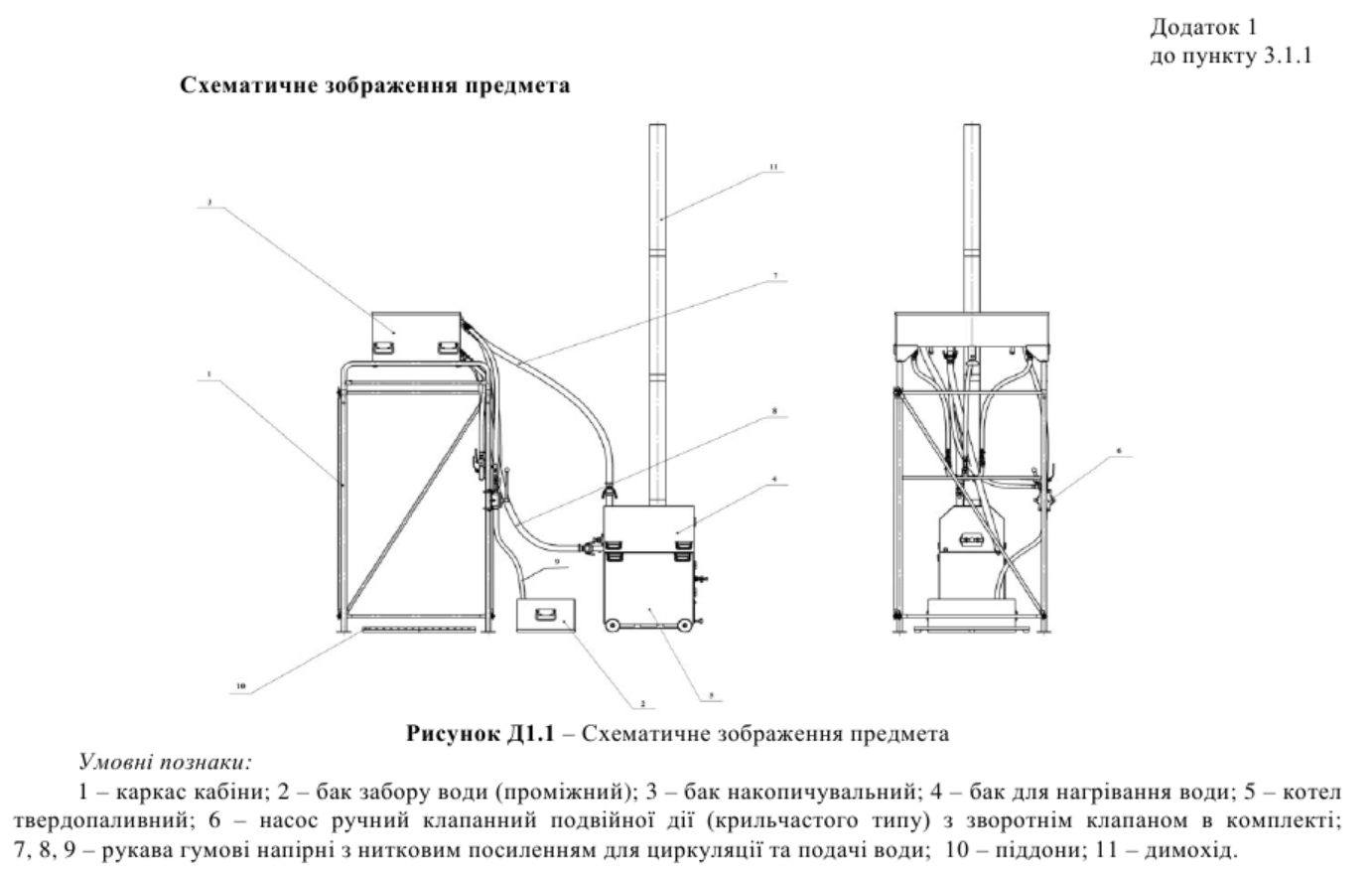 За технічною специфікацією, кожен комплект повинен включати твердопаливний котел, бак для нагрівання води, накопичувальний бак, проміжний бак забору води, систему водопостачання та кабіну з каркасу, штори і піддонів.