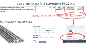 У підсумковій відомості ресурсів гарячекатану арматурну сталь періодичного профілю класу А-ІІІ діаметром 10 мм врахували по 57 379 грн/т, діаметром 12 мм – по 57 120 грн/т, діаметром 20-22 мм – по 55 320 грн/т (тут і далі ціни вказано із ПДВ).