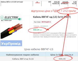 Мідний силовий кабель ВВГнг-LS 5х16 врахували по 1 212 грн/м. Зараз інтернет-магазин «Електрик» продає такий кабель по 333 грн/м, а компанія «УкрПровід» пропонує по 460 грн/м, що втричі дешевше.