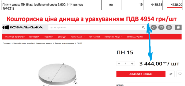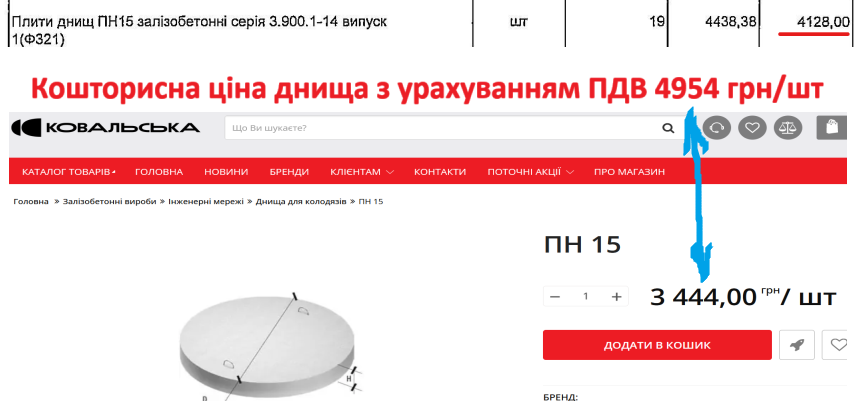 Залізобетонні плити днищ ПН 20 враховано по 10 889 грн/шт. У «Ковальської» їх можна придбати по 7074 грн/шт., що на 35% дешевше.