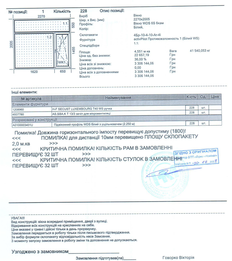 Система визначила найнижчу пропозицію у 10,20 млн грн як аномально низьку. Але «Фірма «Номінал» пояснила, що є офіційним дилером віконного заводу «Osnova» (ПП «Основа-Р», Біла Церква). Той гарантував поставку вікон WDS 6S із 6-камерним профілем, 2-камерним склопакетом 4Бр-10-4-10Ar-4i, ручками, зачепами та підвіконним профілем по ціні 3 186 грн/кв. м. У комерційній пропозиції виробника йшлося про знижку 36%. Також учасник на вимогу замовника усунув різні невідповідності, після чого його визначили переможцем.