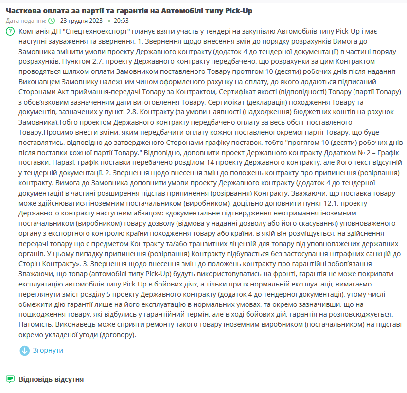 «Спецтехноекспорт» висловив пару побажань щодо договірних умов, а також вказав на проблему з вимогою замовника щодо гарантії на автомобілі не менше року.