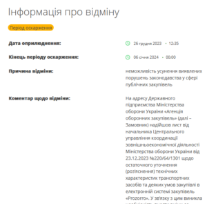 У протоколі про відміну вказано, що це було зроблено через лист від начальника Центрального управління координації зовнішньоекономічної діяльності Міністерства оборони України від 23.12.2023 №220/64/1301 щодо остаточного уточнення (роз’яснення) технічних характеристик транспортних засобів та деяких умов закупівлі в електронній системі закупівель «Prozorro».