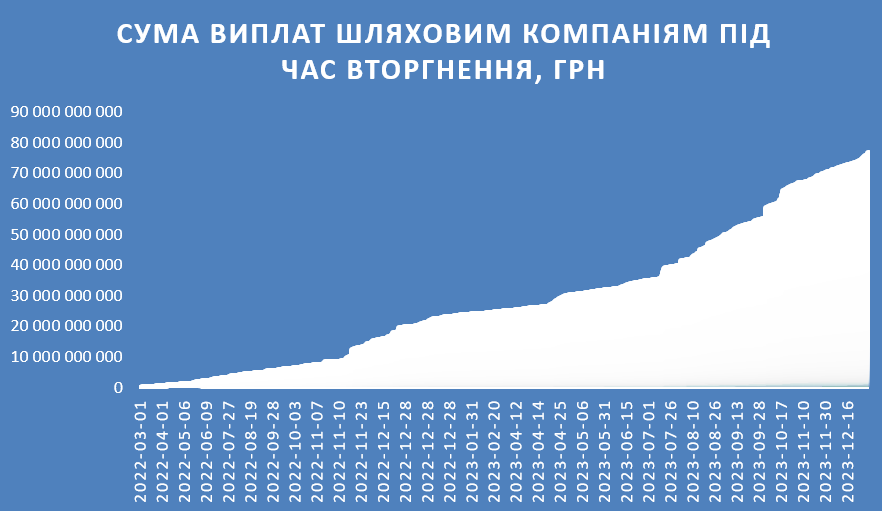 За два роки з початку вторгнення півсотні найбільших шляхових компаній України отримали виплати на 76,56 млрд грн від Держвідновлення та місцевих органів влади. Це все ще менше, ніж отримали шляховики лише від «Укравтодору» у 2021 році – 114,40 млрд грн. Про це свідчать дані пошуково-аналітичної системи «007» (дані з 1 березня 2022 по 31 грудня 2023 р).