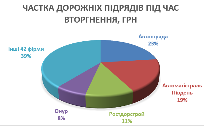 Серед компаній є два безумовні лідери, які отримали понад 42% всіх виплат – колишні лідери картелю «Автострада» (17,62 млрд грн) і «Автомагістраль-Південь» (14,75 млрд грн). Їхнє домінування забезпечили великі підряди Держвідновлення на накриття підстанцій і водогони. Однак, за даними «Наших грошей», ці дані – неповні. Оскільки перші контракти на накриття на суму понад 10 млрд грн були засекречені – звіти про них не оприлюднили в «Прозорро» і по ним не видно проводок в «Е-дата».