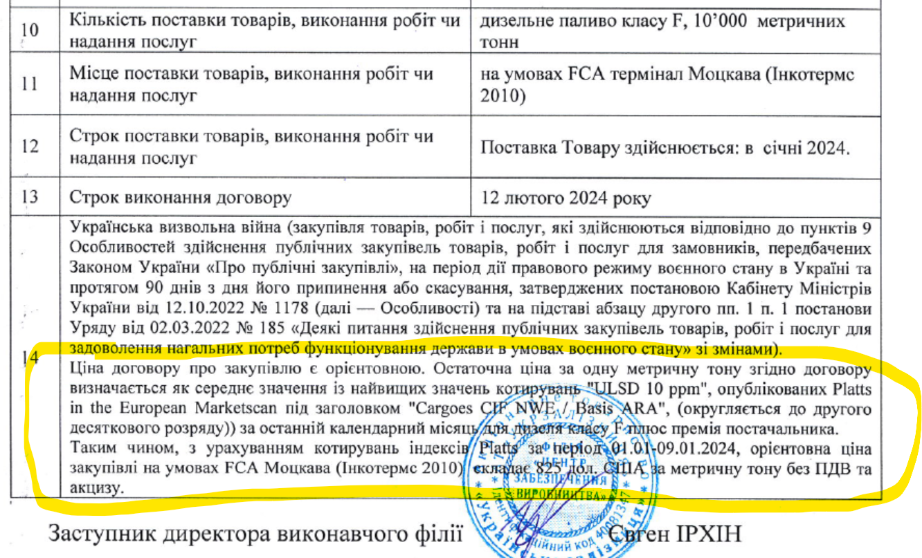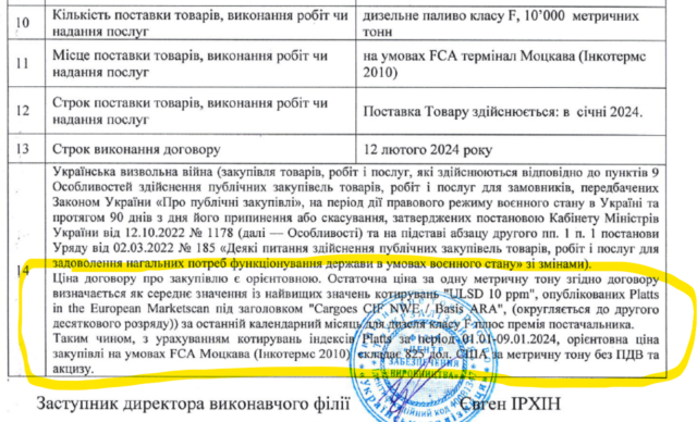 Раніше залізниця в звітах публікувала тільки загальні параметри контракту (обсяг, сума), то нині вперше у звіті про дизельний контракт з виробником «Orlen Lietuva» вартістю $9,13 млн вказана орієнтовна ціна за тону дизельного палива – 825 доларів за тону на умовах FCA термінал Моцкава (Литва) без урахування акцизу, ПДВ та з прив’язкою до індексів Platts.