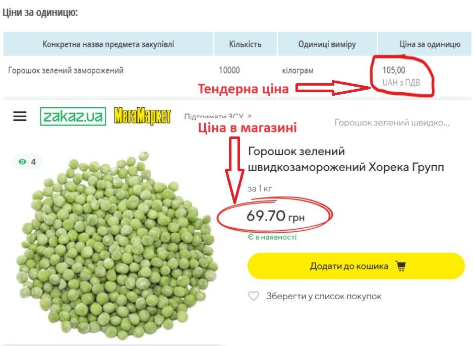 Зелений горошок врахували по 105 грн/кг, хоча в «Мегамаркеті» його можна купити по 70 грн/кг, що в півтора рази дешевше. Компанія «Vova», постачальник професійних продуктів для індустрії гостинності, пропонує його по 72 грн/кг. Управління освіти Голосіївської РДА днями замовляло зелений горошок по 84 грн/кг, що на 20% дешевше.