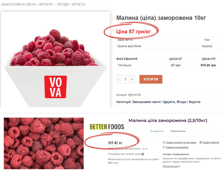 Малину врахували по 258 грн/кг. «Vova» пропонує її по 87 грн/кг, що майже в три рази дешевше. «Беттер фудс» продає її по 105 грн/кг, що в 2,5 рази дешевше. Ситковецька спеціальна школа у Вінницькій області у грудні купувала малину по 87 грн/кг, що втричі дешевше від нинішнього контракту. Відділ освіти Коростенської міської ради Житомирської області тиждень тому замовив малину по 118 грн/кг, що вдвічі дешевше.
