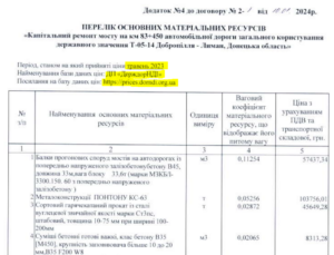 Підсумкова відомість ресурсів і локальні кошториси не опубліковані, тому порівняти ціни будматеріалів із нинішніми ринковими цінами неможливо. Натомість разом із договором оприлюднили Договірну ціну за укрупненими показниками вартості, яка містить лише ціни на роботи без зазначення цін на будматеріали. У ній вказано, що вона складена за поточними цінами станом на 27 грудня 2023 року. Ще оприлюднили Перелік матеріальних ресурсів, у якому не розділено вартість будматеріалів і вартість їхньої доставки до місця робіт. До того ж, у ньому стоїть посилання на базу даних цін ДП «ДерждорНДІ» за травень 2023 року. Саме травень 2023 року свого часу був вказаний в експертному звіті щодо кошторису ремонту.