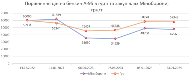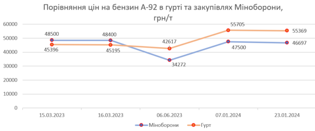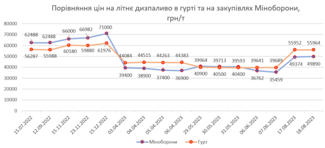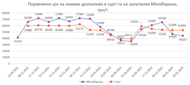 По всіх видах палива від початку вторгнення закупівельні ціни Міноборони перевищували ринкові на 7-33%. І в усіх випадках починаючи з весни 2023 року ціни Міноборони впали нижче гуртових на 10-20%.