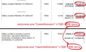 Того ж дня АТ «Чернігівобленерго» замовило реконструкцію кабельної лінії з такою ж післяоплатою. Кабель АПвЭгаПу-15 1х240/35 коштував 696 грн/м, що на 14% дешевше.