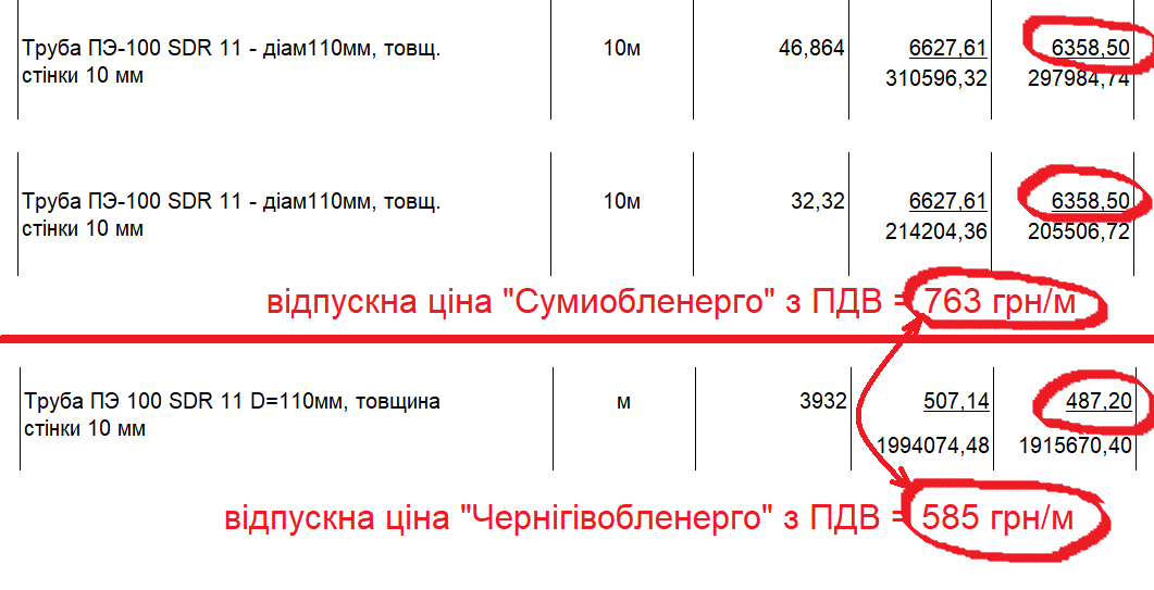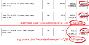 Причому обидві кошторисні ціни труб вище ринкового рівня. Виробник «Трубполімергруп» пропонує таку трубу по 277 грн/м, що майже втричі дешевше від «Сумиобленерго» і вдвічі дешевше від «Чернігівобленерго». Компанія «Євротрубпласт» продає її по 456 грн/м, тобто на третину дешевше від «Сумиобленерго» та на чверть дешевше від «Чернігівобленерго».