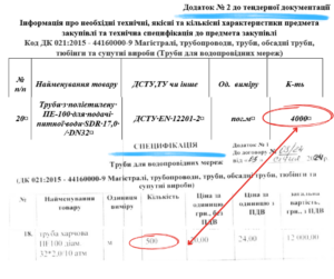 Відповідно до технічної специфікації, замовнику потрібно було 4000 м труби з поліетилену ПЕ-100 для питної води SDR 17,0 / DN32, проте за договором замовили 500 м такої труби.