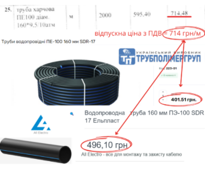 Трубу ПЕ100 діаметром 160х9,5 мм врахували по 714 грн/м (тут і далі ціни вказано з ПДВ). Виробник «Трубполімергруп» пропонує їх по 402 грн/м, що на 44 % дешевше. Сайт «All Electro» продає такі труби виробництва «Ельпласт» по 496 грн/м, що на 31% дешевше.