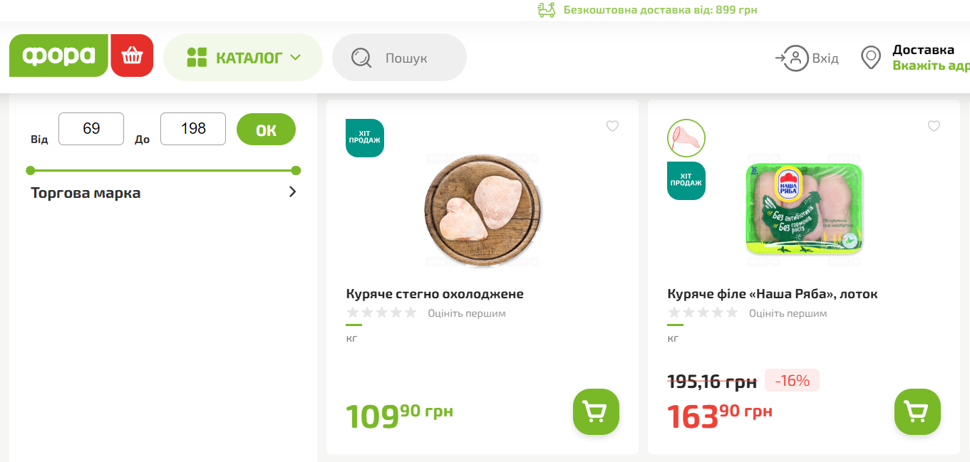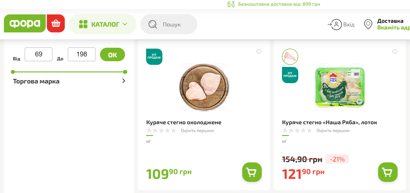 Зокрема замовили куряче філе по 198 грн/кг. У Гребінках є супермаркет «Фора», а на сайті цієї мережі вагове філе без знижки та фасоване в обгорнуті плівкою лотки філе «Наша ряба» за знижкою зараз коштують однаково – 164 грн/кг, що на 17% дешевше.