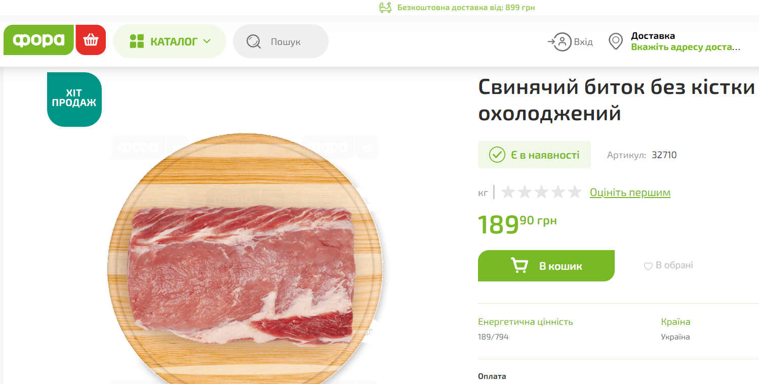 Ще в Гребінки поставлять свинину по 267 грн/кг. У «Форі» вона коштує максимум 190 грн/кг за биток без кістки, що 29% дешевше. Інші частини без кістки зараз ще дешевші.