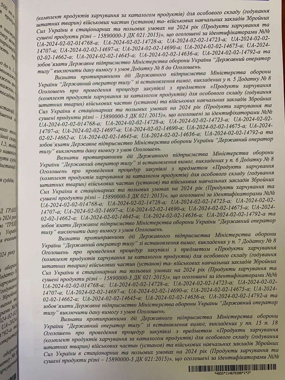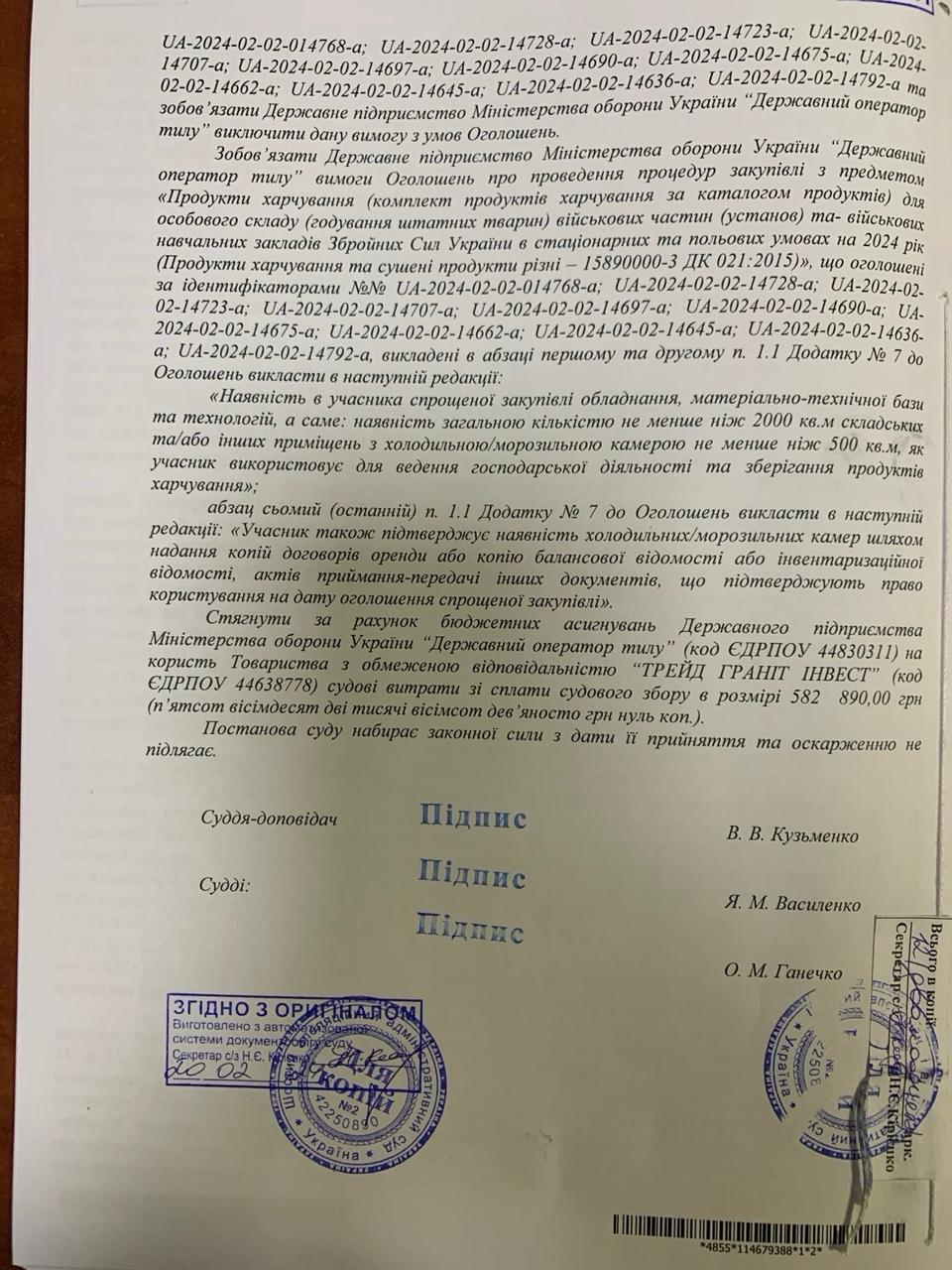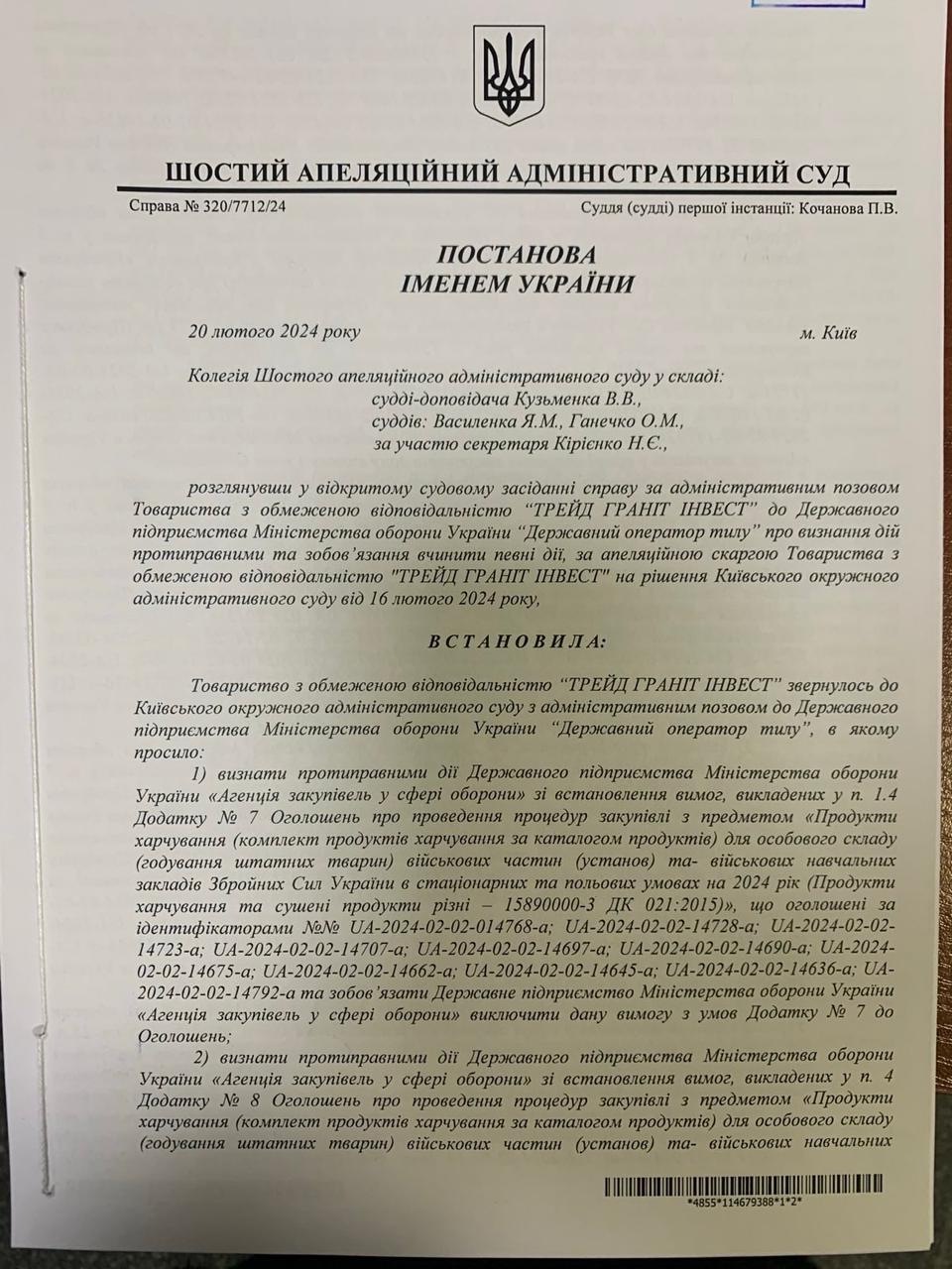 Суд виніс рішення 20 лютого, напередодні дня, коли мали відбутись аукціони в закупівлях послуг харчування для Збройних сил України на квітень-червень цього року (3,76 млрд грн, 3,07 млрд грн, 0,05 млрд грн, 0,42 млрд грн, 0,35 млрд грн, 0,49 млрд грн, 0,05 млрд грн, 1,05 млрд грн, 1,05 млрд грн, 0,28 млрд грн, 0,28 млрд грн).