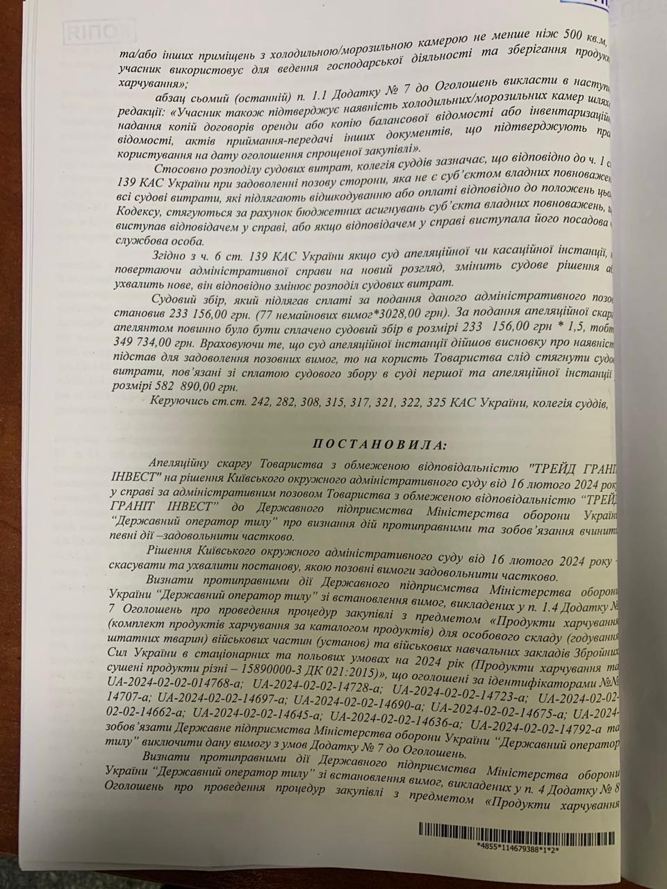 Колегія Шостого апеляційного адміністративного суду 20 лютого наказала «Державному оператору тилу» знести вимоги, які заважали одному з попередніх постачальників харчів для ЗСУ взяти участь у нових закупівлях на загальну суму 10,85 млрд грн. У тому числі знесено вимогу про те, щоб склади учасників закупівлі проходили знезаражування від крис та комах.