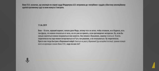 Суддею-доповідачем по справі був Володимир Кузьменко. Це один з «суддів Майдану», який забороняв українцям протестувати проти угрупування Януковича.  Колишній голова ліквідованого ОАСКу Павло Вовк у розмові про відмазування суддів апеляційної інстанції від дисциплінарної відповідальності називав його “нашим”: