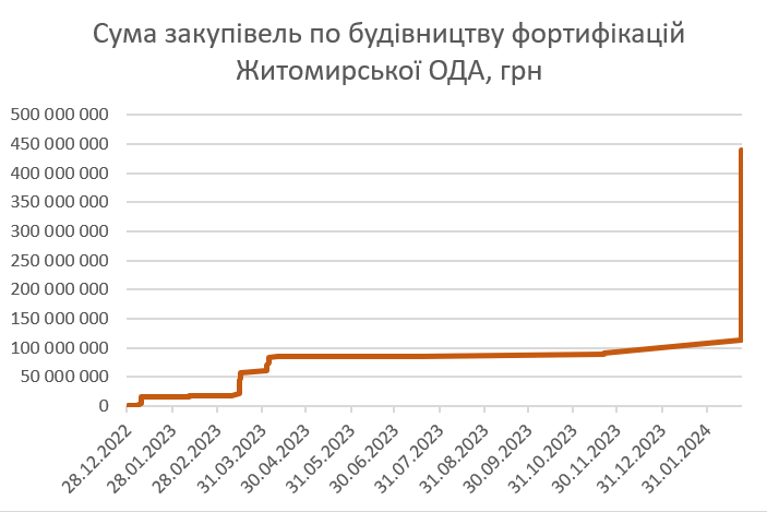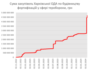 У топ-10 не ввійшла жодна з сотні(!) закупівель Харківської ОДА по будівництву фортифікаційних споруд, оскільки кожна з них була розміром менше 45 млн грн. Але загальна сума вражає – за останні дні адміністрація Євгена Синєгубова законтрактувала будівництво фортифікацій на 2,02 мільярди гривень. Як видно з графіка, таким чином ОДА за тиждень фактично подвоїла свій портфель «оборонних» замовлень. Всі ці угоди були укладені у лютому, коли падіння Авдіївки було очевидне, а тиск рашистів на Харківщину лише посилився. Краще пізно, ніж ніколи.