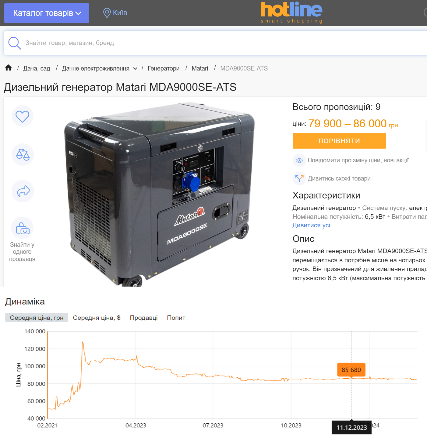 Зокрема замовили десять дизельних генераторів Matari MDA9500E номінальною потужністю 6,5 і максимальною потужністю 7 кВт з автостартом по 174 тис грн. Однак динаміка цін на сервісі «Hotline» показує, що на дату договору середня ціна MDA9500E-ATS з автостартом становила 88 тис грн, що вдвічі дешевше. Нині цю модель продають максимум по 92 тис грн.