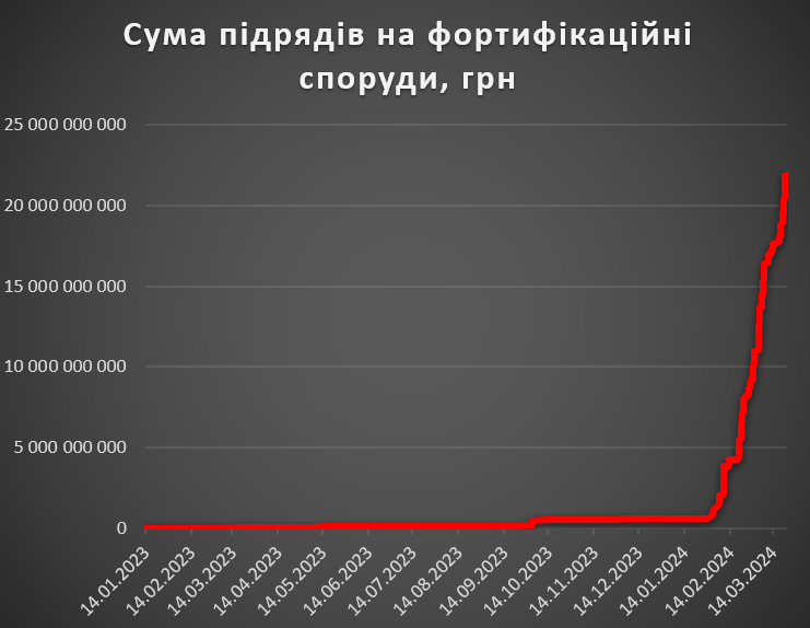 Вже другий місяць поспіль чверть всіх закупівель припадає на секретні будівництва фортифікаційних споруд. За тиждень обладміністрації прозвітували у «Прозорро» про будівельні підряди на 4,25 млрд. А з початку лютого загалом на 21,21 млрд грн (для порівняння – за весь 2023 рік фортифікаційних замовлень було всього 0,64 млрд грн).