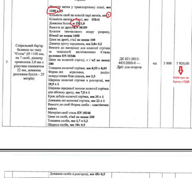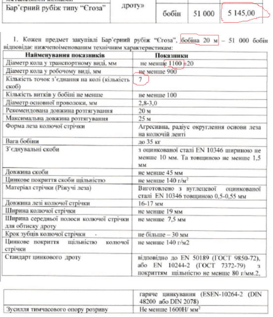 Наприклад, одна з військових частин Чернігівщини замовила «Єгози» та путанки на 677 млн грн. Тут бар’єрний рубіж Ø1100 мм на 7 скоб з оцинкуванням скоби і стрічки щільністю від 140 грамів на м2 замовили по 5 145 грн за 20-метрову бухту з урахуванням ПДВ. Тобто ціна одного метра на рівні 250 грн: