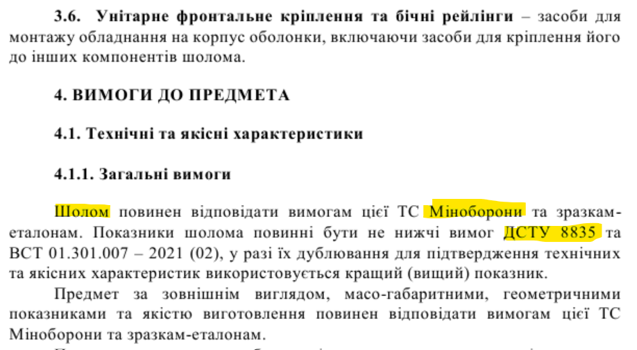 Також Нацгвардія вимагала захист голови по 2-му класу захисту (скрін нижче праворуч). А в вимогах Міноборони йшлось про 1-й клас захисту (скрін ліворуч). Однак ці обидві вимоги передбачають відповідність одному і тому ж ДСТУ 8835. Відтак «Темп-3000» мав право пропонувати на різних торгах один і той же шолом «Каска-2м».