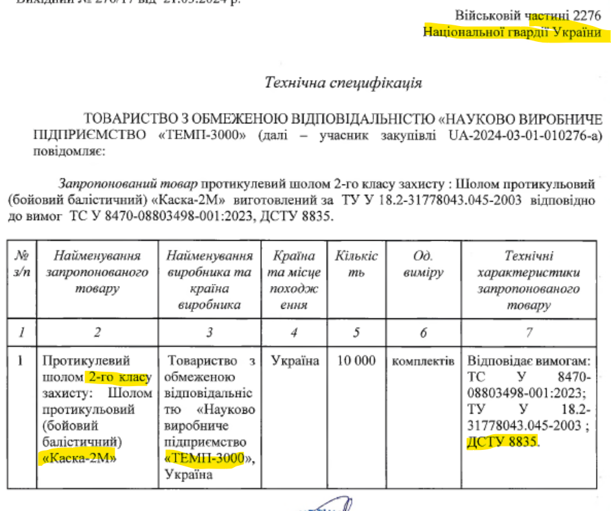 Військова частина 2276 Національної гвардії України за 99,60 млн грн замовила ТОВ «Темп-3000» повнорозмірні шоломи «Каска-2м» по 9 960 грн за комплект. Шоломи повинні мати фронтальну платформу для кріплення приладу нічного бачення  та два бокові рейлінги.