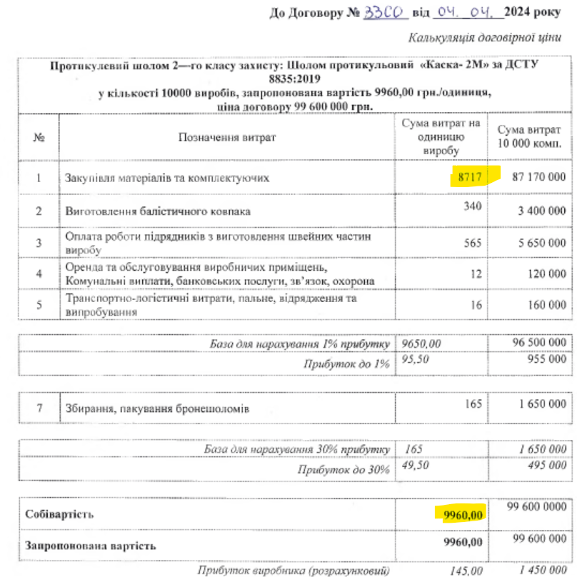 У тендері Нацгвардії «Темп-3000» завантажив документ з калькуляцією ціни. З нього слідує, що у ціні кожного шолому майже 90 відсотків припадає на матеріали і комплектуючі. Відтак його прибуток, з якого фірма платить податок, становить лише 145 гривень з комплекту ціною 9 960 грн, або 1,5%.