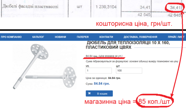 Пластмасові фасадні дюбелі коштують 34,41 грн/шт. Важко зрозуміти, що це за ексклюзивні дюбелі, але «ХАЦ» знайшов у продажу пластикові фасадні дюбелі для теплоізоляції по 84 грн за упаковку зі 100 штук, тобто по 85 коп./шт. Також вдалося знайти безліч варіантів дюбелів із металевим стрижнем. Більшість із них коштують від 1 грн до 5 грн за штуку.