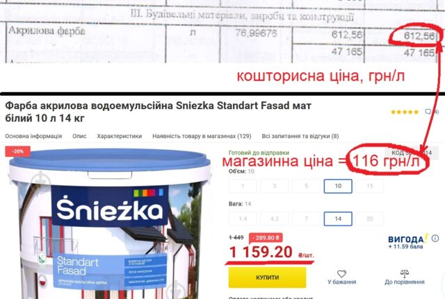 Наприклад, акрилову фарбу врахували по 612 грн/л. У магазинах багато акрилових фарб для зовнішніх покриттів за цінами, нижчими у багато разів. Зокрема «Епіцентр» продає білу акрилову водоемульсійну фарбу Sniezka Standart Fasad по 116 грн/л, що уп’ятеро дешевше.