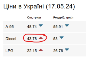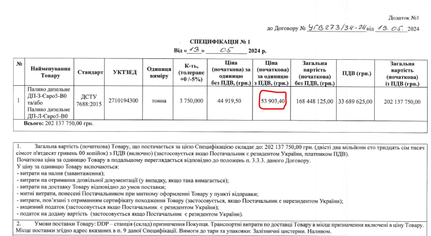 Початкова ціна дизелю в угоді вийшла хороша для постачальника – 53 903 грн/т з урахуванням ПДВ та з доставкою залізницею до складу замовника в Україні. Це відповідає приблизно 45 грн за літр (при густині 0,83 г/см3). Що навіть трохи вище середніх оптових цін, які, за даними «Enkorr», цими днями знаходяться на рівні 44 грн/л. І дорожче від квітневого контракту «Укрзалізниці», яка замовила на заводі-виробнику «Orlen Lietuva» дизель по 52 869 грн за тону.