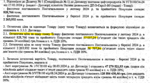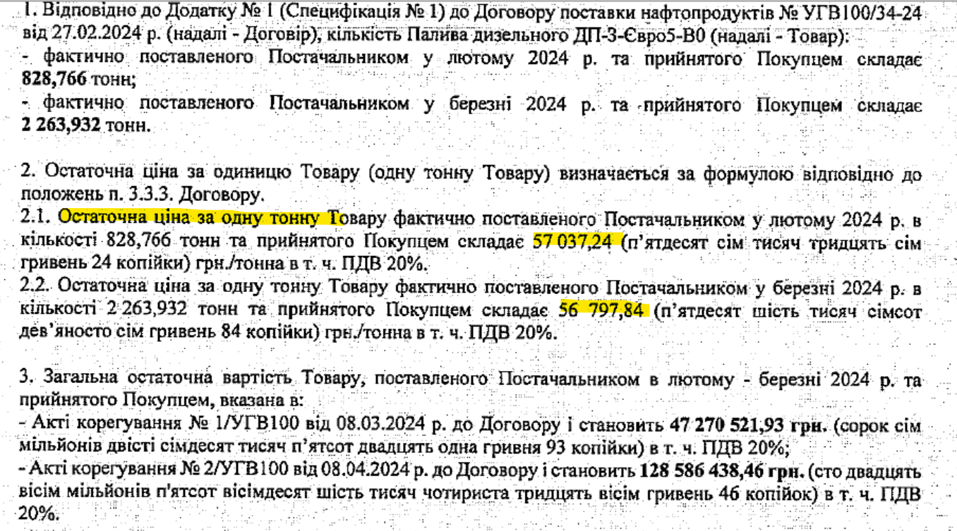 В угоді також є формула визначення остаточної ціни поставленого палива. Вона передбачає, що ціна має змінюватись при ринкових коливаннях. Наприклад, у лютому цього року «УГВ» уклало угоду з «Альянсом» на поставку дизеля з початковою ціною 51 784 грн/т. А потім за результатами поставок уклали додаткову угоду, якою остаточну ціну зафіксували у розмірі 57 037 у лютому і 56 798 грн у березні.