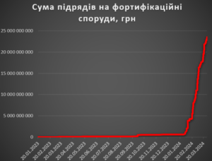 Всього у «Прозорро» оприлюднені дані про фортифікаційні підряди на суму 26,4 млрд грн. За весь 2023 рік фортифікаційних замовлень було всього на 0,6 млрд грн. Основні замовлення почалися тільки з середини лютого цього року, коли стало відомо про критичний стан оборони Авдіївки і почався відступ. Відтак спішні замовлення в авральному порядку теж додавали цінового ажіотажу в умовах дефіциту.