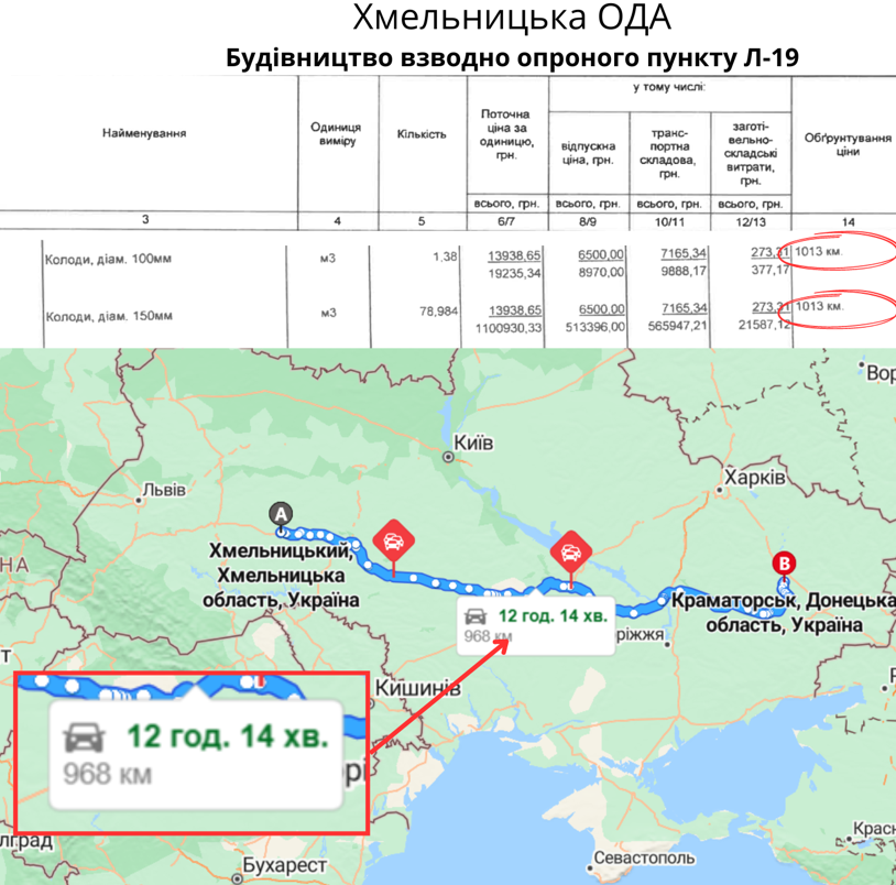 Відмітимо цікаві нюанси з доставкою деревини для фортифікацій. Найбільше тут відзначилась Хмельницька ОДА. Її колоди й так були вдвічі дорожчими від ринку – 7 800 грн за куб. Але хмельничани вписали в кошторис ще й доставку по 8 598 грн за куб на відстань 1 013 кілометрів (це відповідає відстані між Хмельницьким і Донеччиною). У результаті хмельницька деревина для фортифікацій обійшлась у 16 400 гривень за кубометр. Що в рази перевершує всі уявлення про ринкові ціни.