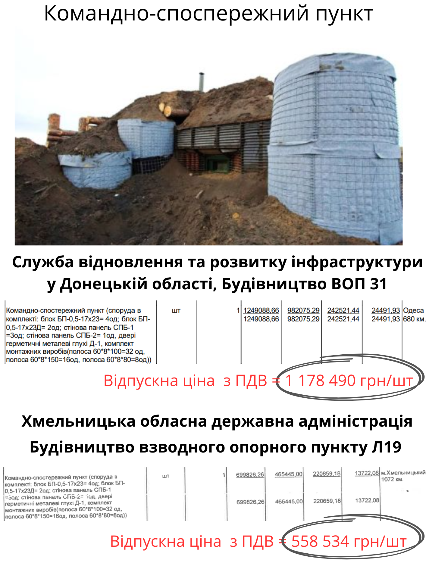 Наприклад, залізобетонні споруди Командно-спостережних пунктів для донецької Служби відновлення обійшлись у 1,2 млн грн за штуку, а Хмельницькій ОДА вдвічі дешевше – 0,6 млн грн (в обох випадках доставка не входить у ціну товару, а вказана окремо).