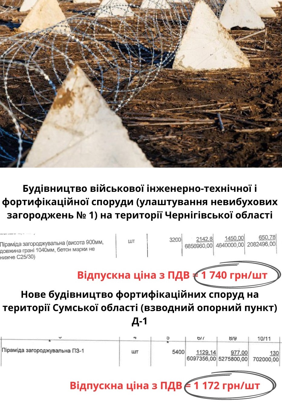 У фортифікаційних кошторисах ми побачили найдорожчі пірамідки по 1 740 грн/шт у Чернігівської ОДА. В одному з чернігівських кошторисів вартістю 14 млн грн враховано 3 200 таких пірамідок на 8 млн грн. Відтак, якби їх купували хоча б на триста гривень дешевше, то тільки по цьому контракту економія могла б скласти більше 1 млн грн.