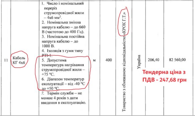 На тендер подавалось ТОВ «Азовкабель», чия пропозиція була на 800 тис грн або 8% дешевше від пропозиції майбутнього переможця. Однак замовник відхилив дешевшу пропозицію через те, що у ній кілька кабелів були не з тими технічними характеристиками оболонки, що хотів замовник. Метрополітену було потрібно, щоб кабелі КГ 3х2,5; 3х2,5+1х1,5; 4х6; 4х10 мали ізоляцію з гуми типу РТІ-1 та могли витримати нагрівання струмопровідної жили до +75°С. «Азовкабель» хотів продати метрополітену відповідні кабелі заводу «Приват-кабель». Однак замовник сам звернувся до замовника і спитав чи справді його кабелі задовольняють таким вимогам. На що завод відповів, що кабель саме у ізоляції з гуми РТІ-1 витримає нагрівання жили лише до 65°, а якщо треба більша витримка, то завод готовий зробити кабель з більш сучасних ізоляційних матеріалів, що витримують такі температури.