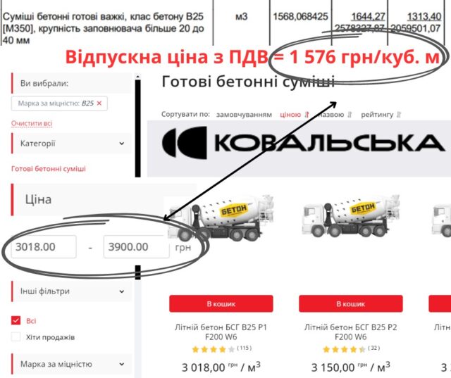 Бетон класу В25 (М350) замовили по 1 576 грн/куб. м, а група «Ковальська» продає його по 3 018-3 900 грн/куб. м.