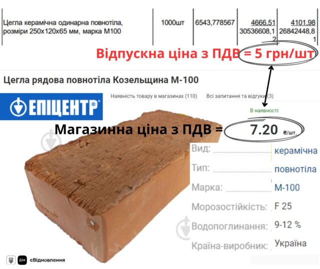 Керамічну повнотілу цеглу розміром 250х120х65 мм марки М100 врахували по 5 грн/шт, а «Епіцентр» її продає по 7 грн/шт.