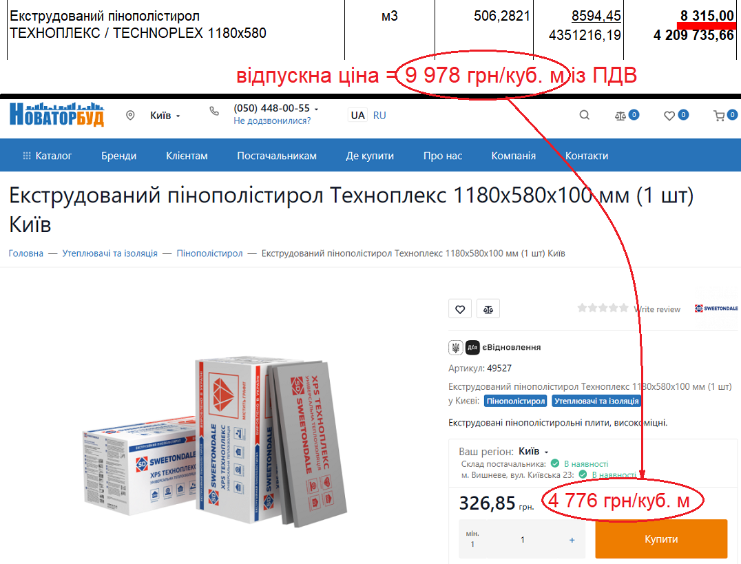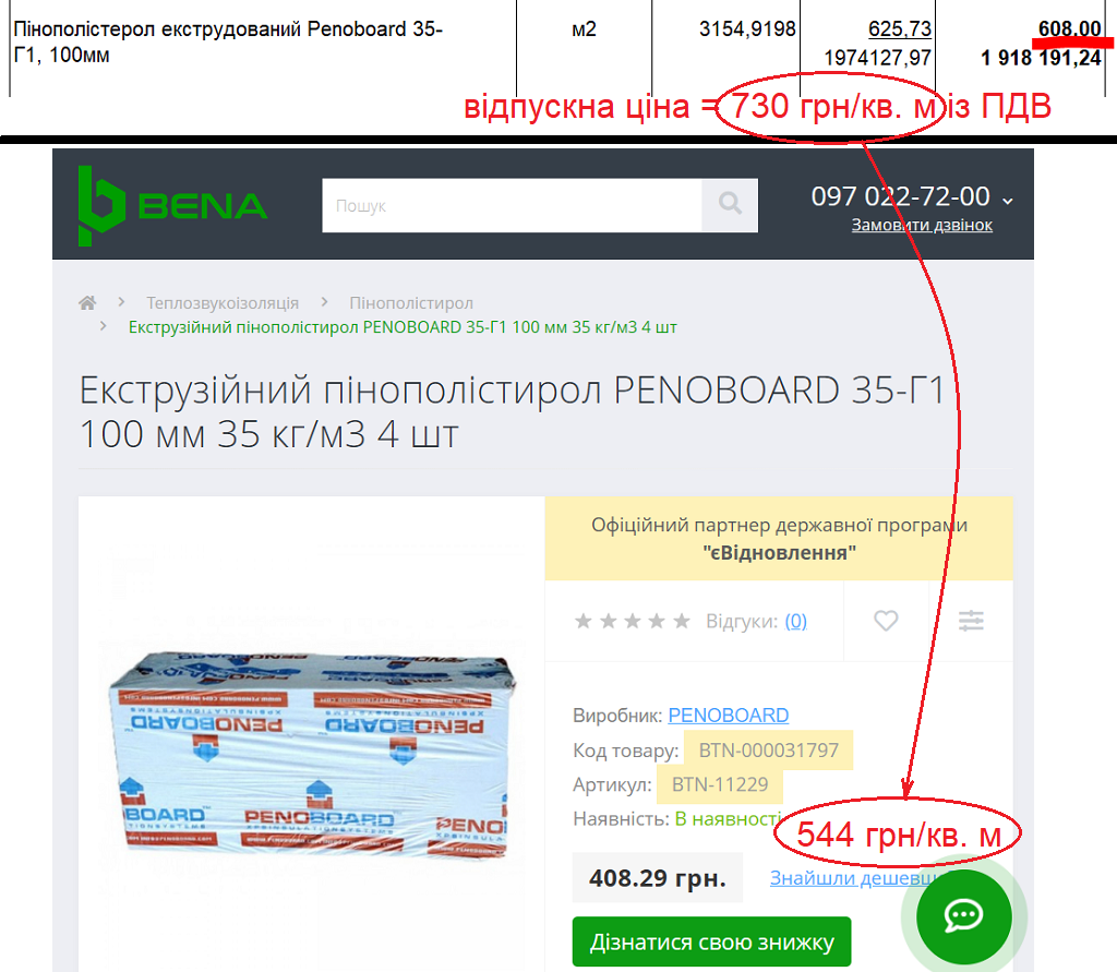 Екструдований пінополістерол Penoboаrd 35-Г1 товщиною 100 мм на 2,30 млн грн коштує 730 грн/кв. м. В інтернет-магазинах його можна знайти по 391–408 грн за лист 1250х600 мм площею 0,75 кв. м. У перерахунку ціна становить 521-544 грн/кв. м, що на чверть дешевше.