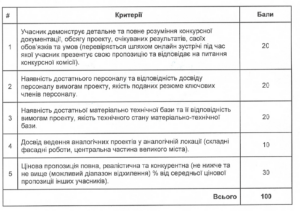 Окрім повної, реалістичної та конкурентної цінової пропозиції, учасники мали подати підтвердження наявності персоналу, матеріально-технічної бази, досвіду аналогічних робіт (складні фасадні роботи в центральній частині великого міста). Кожному з цих критеріїв надається певна кількість балів, які входять в остаточну оцінку пропозиції разом з оцінкою презентації, що проводиться на онлайн-зустрічі. Максимальна оцінка – 100 балів.
